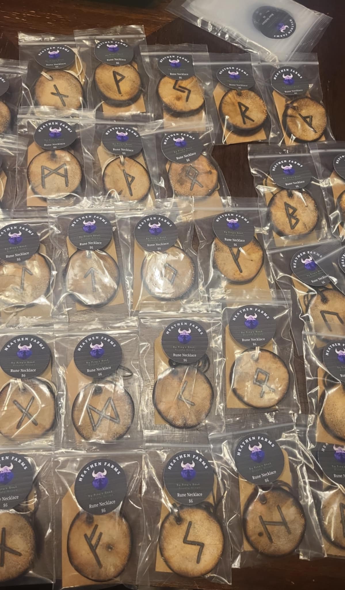 Handcrafted from natural wood slices and etched with ancient Norse runes, each necklace is a one-of-a-kind tribute to heritage, intention, and strength. We finish every piece with rendered beef tallow, giving it a subtle, earthy sheen and natural weather resistance. No two runes or grains are alike.
